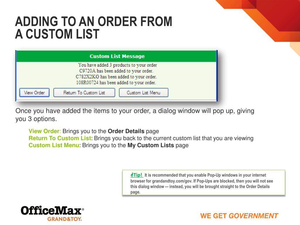 Adding to an Order froma Custom List Once you have added the items to your order, a dialog window will pop up, giving you 3 options. View Order: Brings you to the Order Details page Return To Custom List: Brings you back to the current custom list that you are viewing Custom List Menu: Brings you to the My Custom Lists page Tip! It is recommended that you enable Pop-Up windows in your internet browser for grandandtoy.com/gov. If Pop-Ups are blocked, then you will not see this dialog window -– instead, you will be brought straight to the Order Details page.