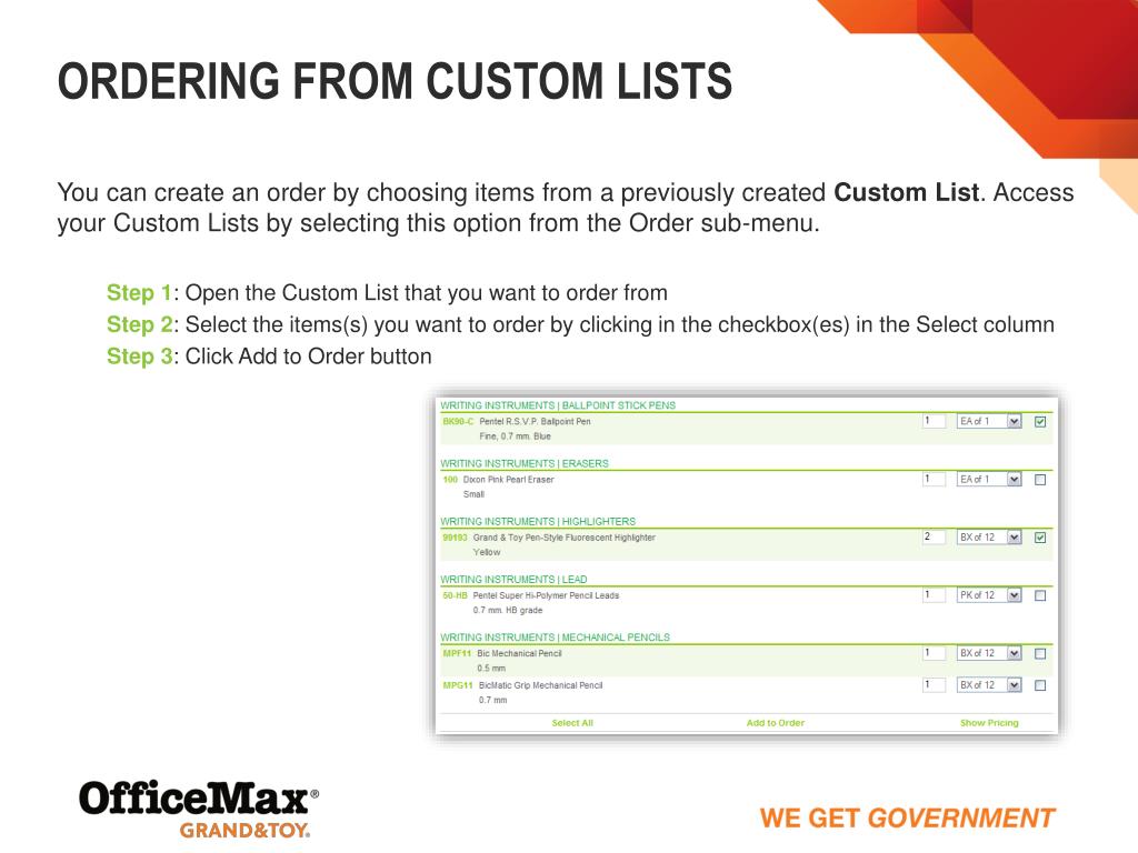 Ordering from Custom Lists You can create an order by choosing items from a previously created Custom List. Access your Custom Lists by selecting this option from the Order sub-menu. Step 1: Open the Custom List that you want to order from Step 2: Select the items(s) you want to order by clicking in the checkbox(es) in the Select column Step 3: Click Add to Order button