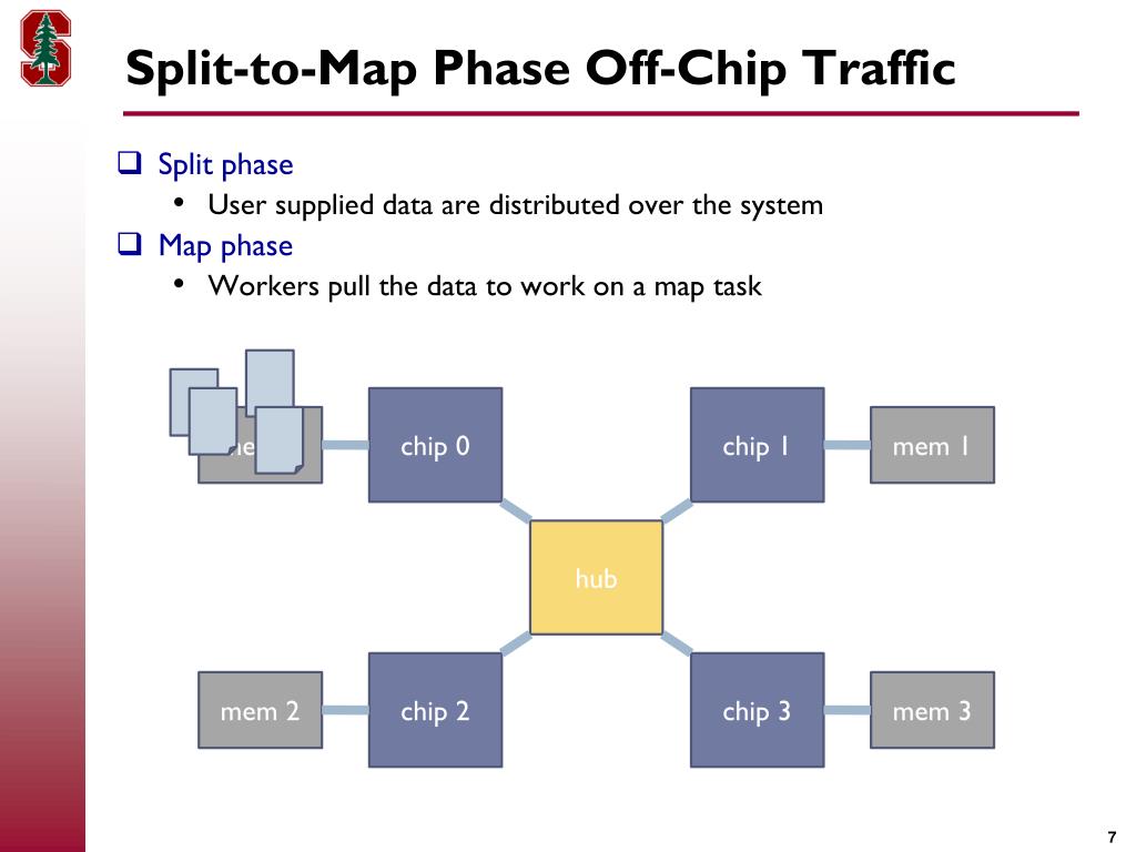 Split-to-Map Phase Off-Chip Traffic • Split phase • User supplied data are distributed over the system • Map phase • Workers pull the data to work on a map task chip 0 chip 1 mem 0 mem 1 hub chip 2 chip 3 mem 2 mem 3
