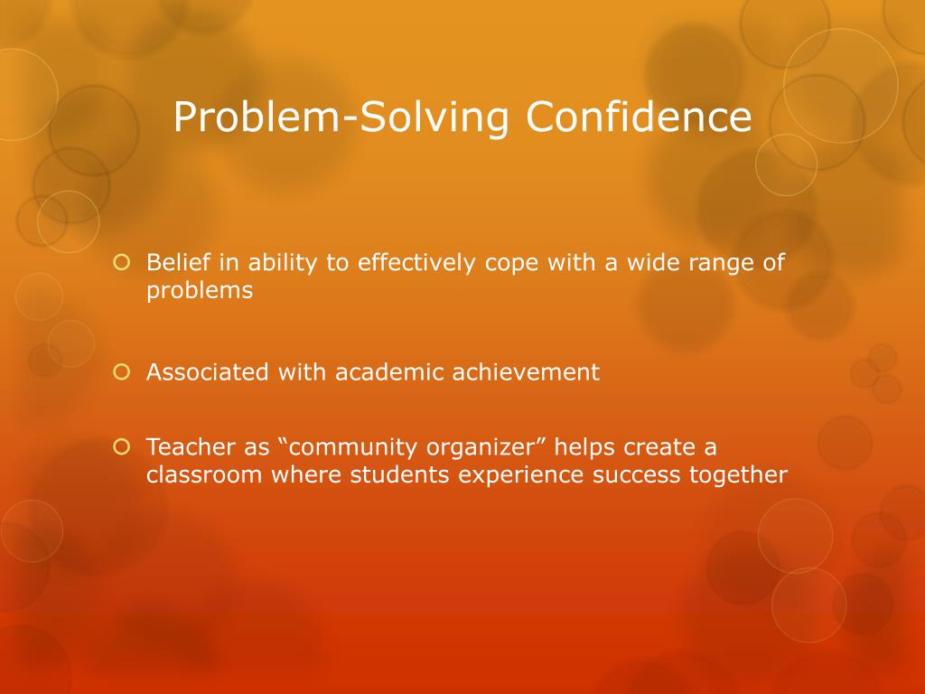 Problem-Solving Confidence • Belief in ability to effectively cope with a wide range of problems • Associated with academic achievement • Teacher as “community organizer” helps create a classroom where students experience success together