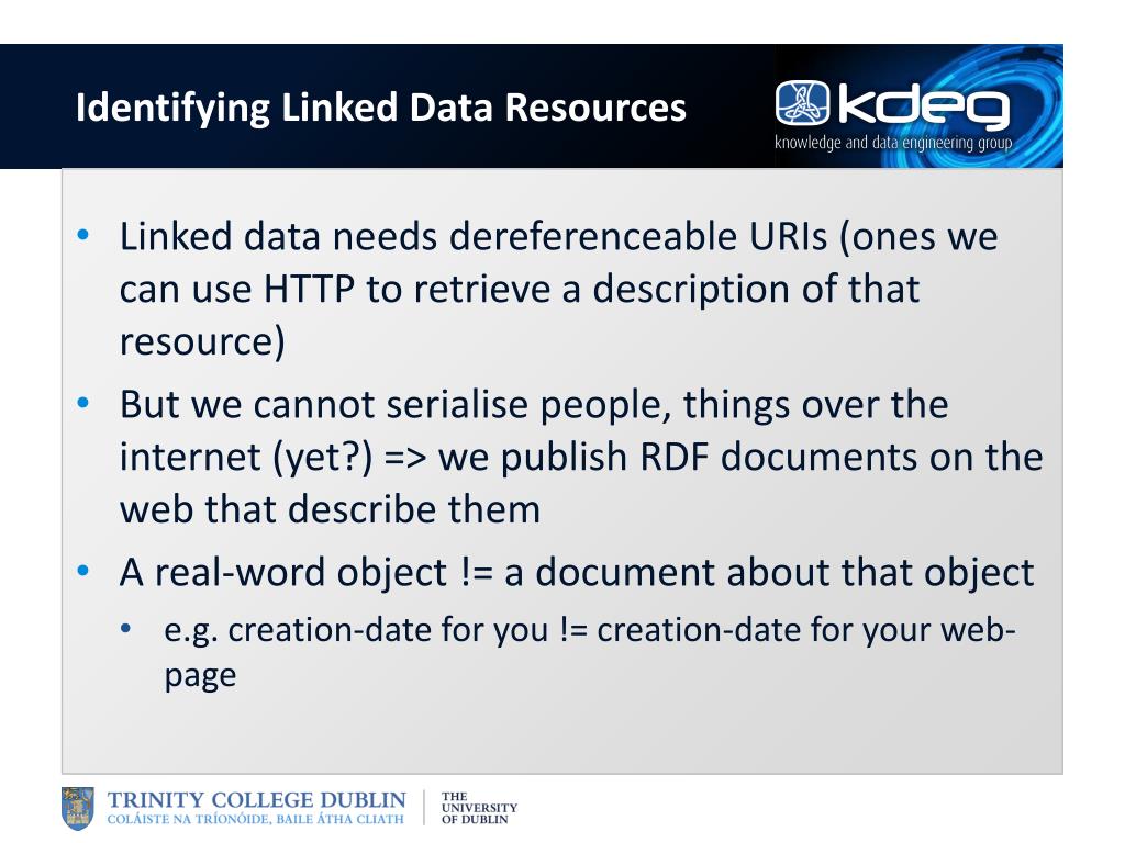 Identifying Linked Data Resources • Linked data needs dereferenceable URIs (ones we can use HTTP to retrieve a description of that resource) • But we cannot serialise people, things over the internet (yet?) => we publish RDF documents on the web that describe them • A real-word object != a document about that object • e.g. creation-date for you != creation-date for your web-page