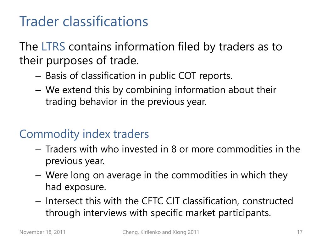 Trader classifications The LTRS contains information filed by traders as to their purposes of trade. • Basis of classification in public COT reports. • We extend this by combining information about their trading behavior in the previous year. Commodity index traders • Traders with who invested in 8 or more commodities in the previous year. • Were long on average in the commodities in which they had exposure. • Intersect this with the CFTC CIT classification, constructed through interviews with specific market participants. Cheng, Kirilenko and Xiong 2011