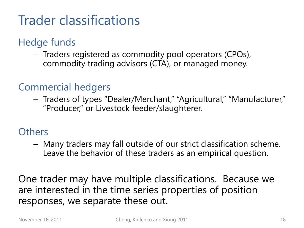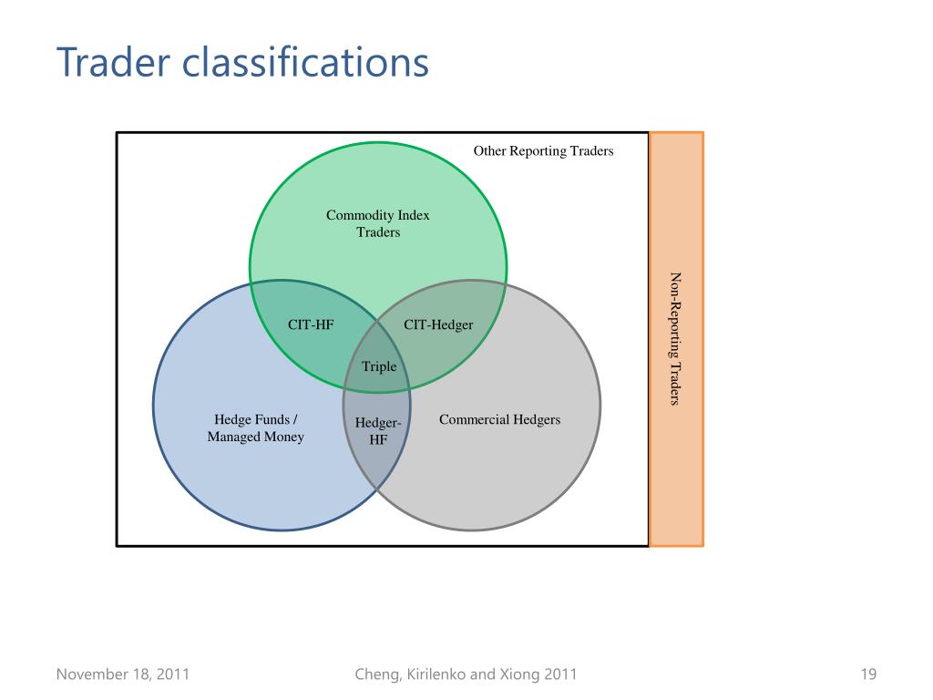 Trader classifications Other Reporting Traders Non-Reporting Traders Commodity Index Traders CIT-HF CIT-Hedger Triple Hedge Funds / Managed Money Commercial Hedgers Hedger- HF Cheng, Kirilenko and Xiong 2011