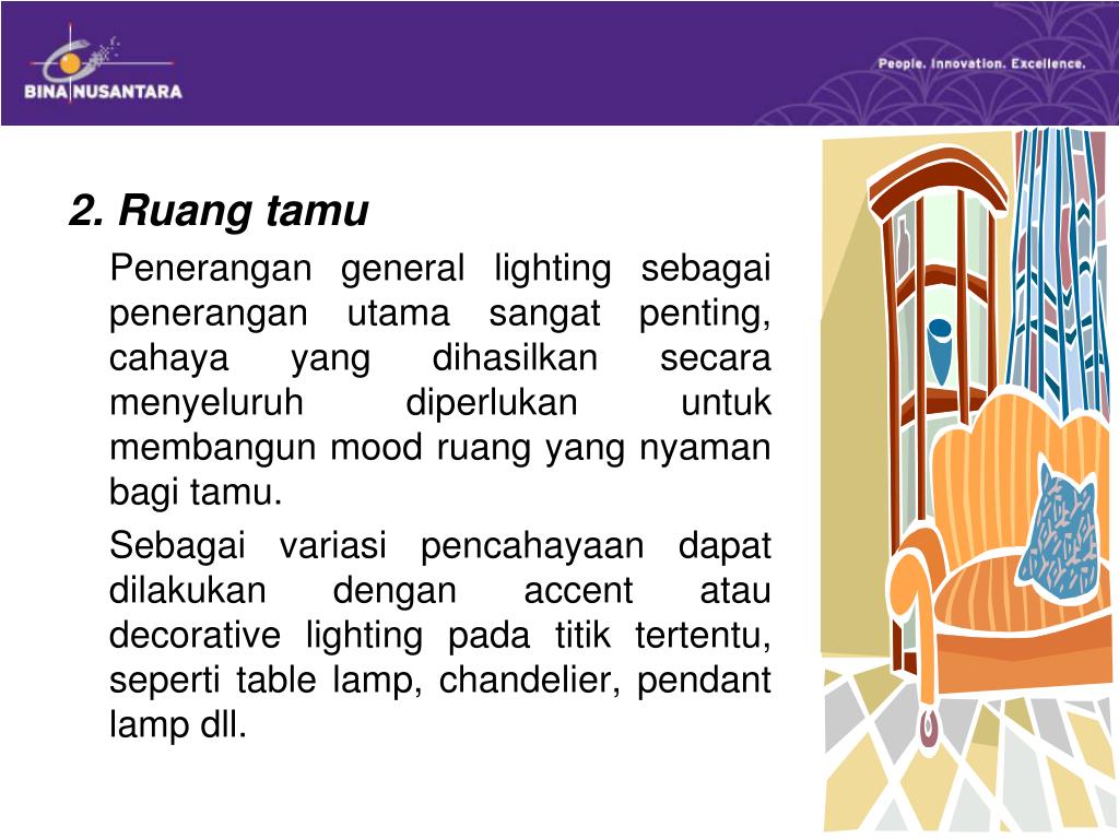 Tata cahaya pada rumah tinggal Yang perludiperhatikandalammerencanakanpenerangan padarumahtinggaladalah : 1. Aktivitas yang dilakukandidalamruangan 2. Dimensiruangan 3. Gunakanbeberapajenispenerangan 4. Dayatarik, kelebihandankekuranganruang 5. Ciptakansuasanadenganpenerangan 6. Manfaatkanpenerangansebagaielemen dekoratif