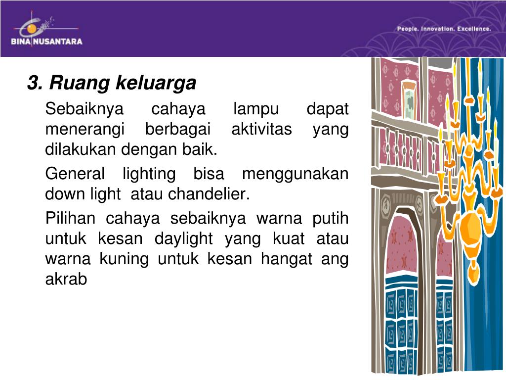 3. Ruang keluarga Sebaiknya cahaya lampu dapat menerangi berbagai aktivitas yang dilakukan dengan baik. General lighting bisa menggunakan down light atau chandelier. Pilihan cahaya sebaiknya warna putih untuk kesan daylight yang kuat atau warna kuning untuk kesan hangat ang akrab