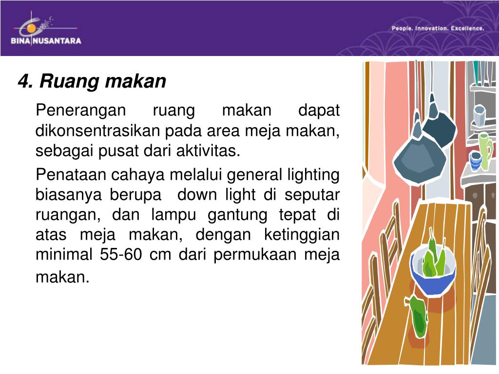 4. Ruang makan Penerangan ruang makan dapat dikonsentrasikan pada area meja makan, sebagai pusat dari aktivitas. Penataan cahaya melalui general lighting biasanya berupa down light di seputar ruangan, dan lampu gantung tepat di atas meja makan, dengan ketinggian minimal 55-60 cm dari permukaan meja makan.