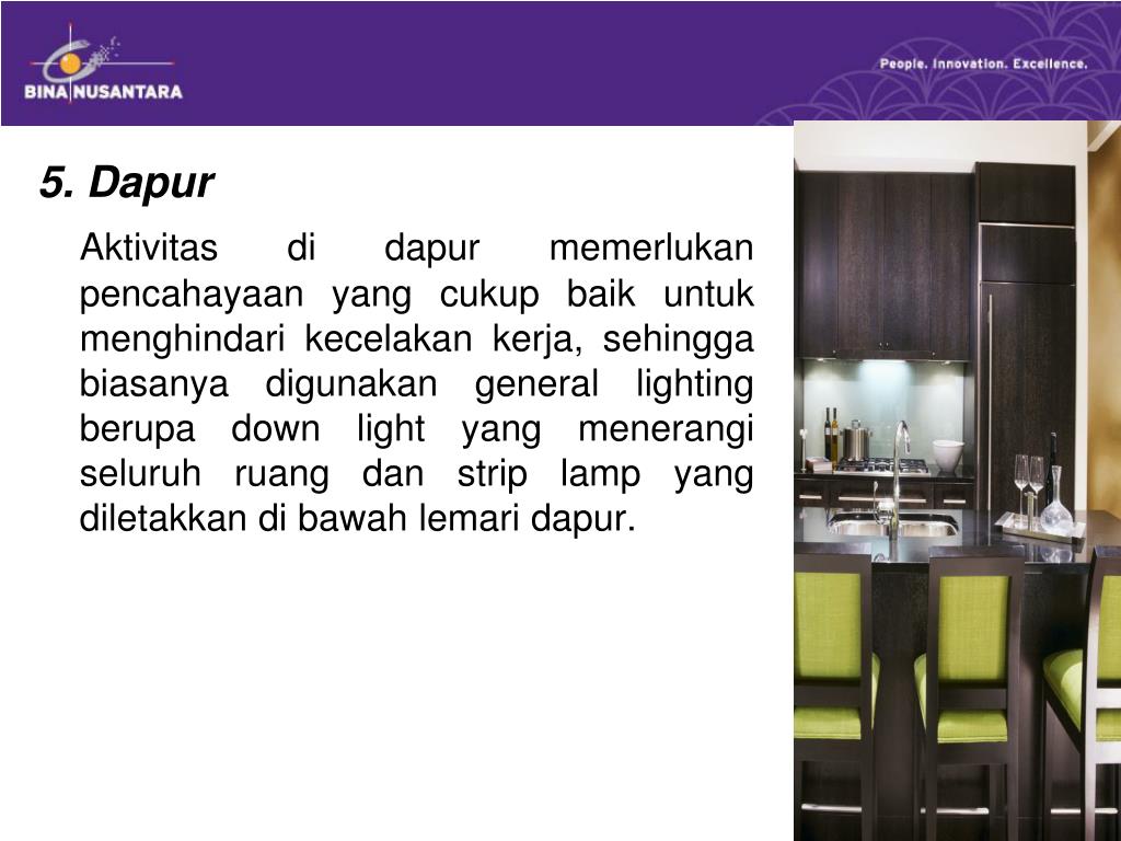 5. Dapur Aktivitas di dapur memerlukan pencahayaan yang cukup baik untuk menghindari kecelakan kerja, sehingga biasanya digunakan general lighting berupa down light yang menerangi seluruh ruang dan strip lamp yang diletakkan di bawah lemari dapur.