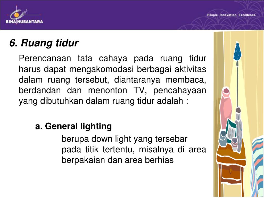 6. Ruang tidur Perencanaan tata cahaya pada ruang tidur harus dapat mengakomodasi berbagai aktivitas dalam ruang tersebut, diantaranya membaca, berdandan dan menonton TV, pencahayaan yang dibutuhkan dalam ruang tidur adalah : a. General lighting berupa down light yang tersebar pada titik tertentu, misalnya di area berpakaian dan area berhias