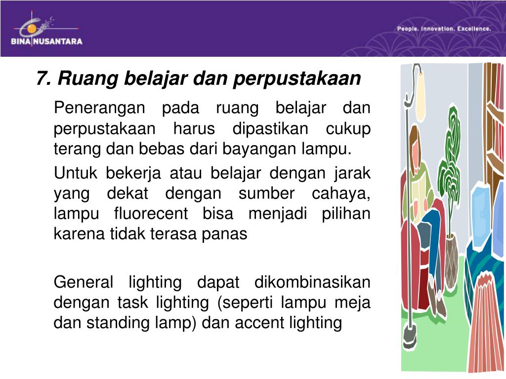 7. Ruang belajar dan perpustakaan Penerangan pada ruang belajar dan perpustakaan harus dipastikan cukup terang dan bebas dari bayangan lampu. Untuk bekerja atau belajar dengan jarak yang dekat dengan sumber cahaya, lampu fluorecent bisa menjadi pilihan karena tidak terasa panas General lighting dapat dikombinasikan dengan task lighting (seperti lampu meja dan standing lamp) dan accent lighting