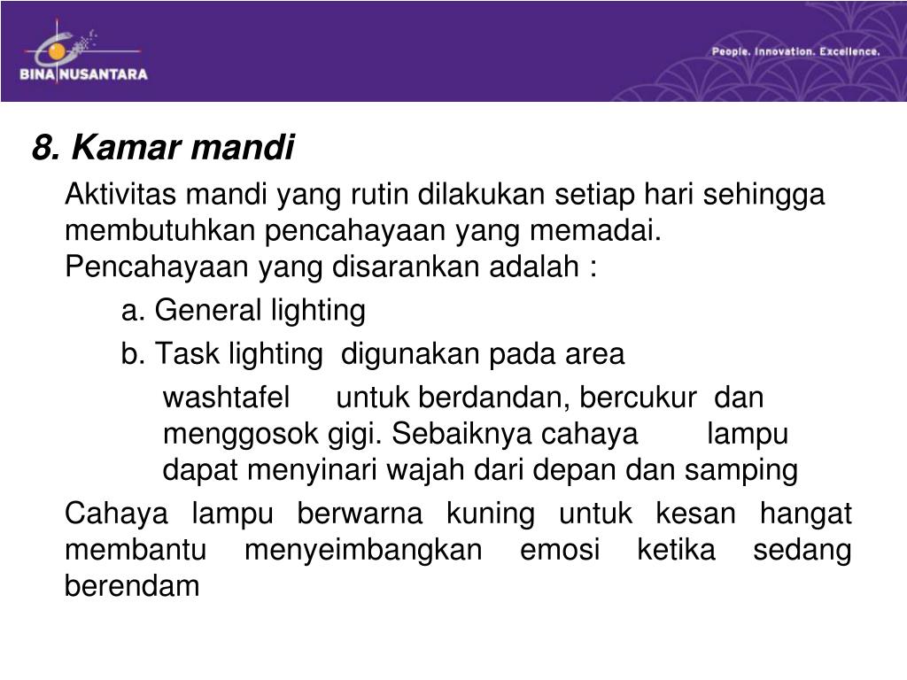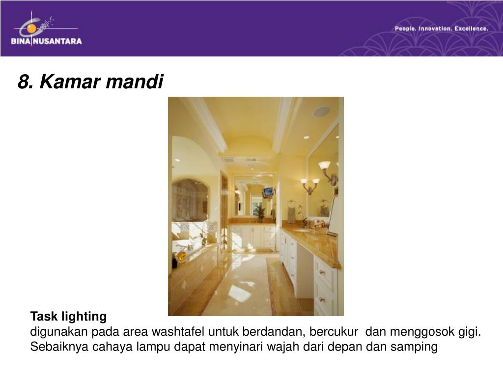 8. Kamar mandi Aktivitas mandi yang rutin dilakukan setiap hari sehingga membutuhkan pencahayaan yang memadai. Pencahayaan yang disarankan adalah : a. General lighting b. Task lighting digunakan pada area washtafel untuk berdandan, bercukur dan menggosok gigi. Sebaiknya cahaya lampu dapat menyinari wajah dari depan dan samping Cahaya lampu berwarna kuning untuk kesan hangat membantu menyeimbangkan emosi ketika sedang berendam