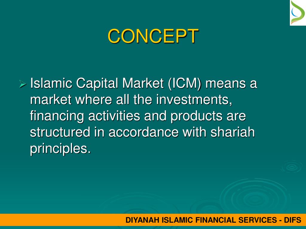 CONCEPT • Islamic Capital Market (ICM) means a market where all the investments, financing activities and products are structured in accordance with shariah principles. DIYANAH ISLAMIC FINANCIAL SERVICES - DIFS