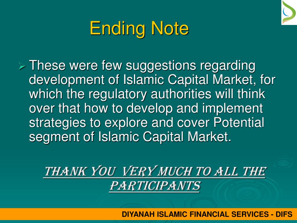 Ending Note • These were few suggestions regarding development of Islamic Capital Market, for which the regulatory authorities will think over that how to develop and implement strategies to explore and cover Potential segment of Islamic Capital Market. THANK YOU very much to all the participants DIYANAH ISLAMIC FINANCIAL SERVICES - DIFS