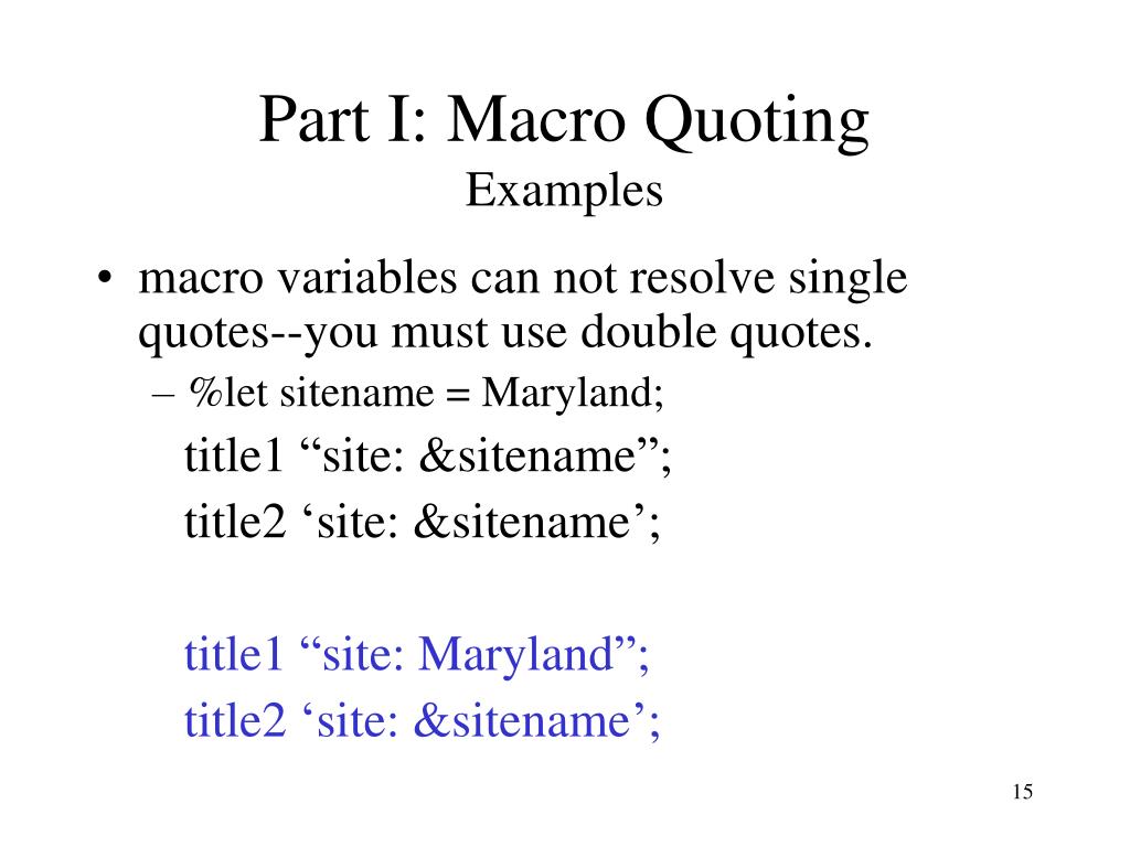 Part I: Macro QuotingExamples • macro variables can not resolve single quotes--you must use double quotes. • %let sitename = Maryland; title1 “site: &sitename”; title2 ‘site: &sitename’; title1 “site: Maryland”; title2 ‘site: &sitename’;