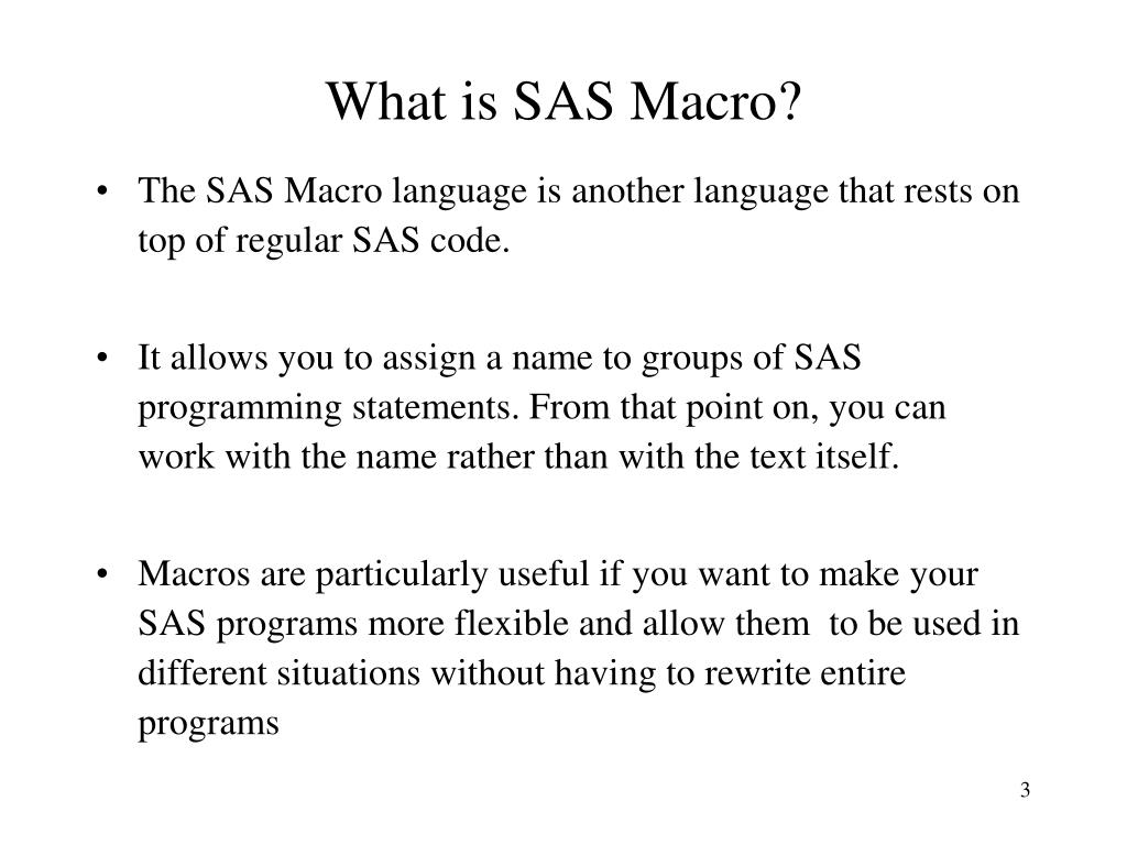 What is SAS Macro? • The SAS Macro language is another language that rests on top of regular SAS code. • It allows you to assign a name to groups of SAS programming statements. From that point on, you can work with the name rather than with the text itself. • Macros are particularly useful if you want to make your SAS programs more flexible and allow them to be used in different situations without having to rewrite entire programs
