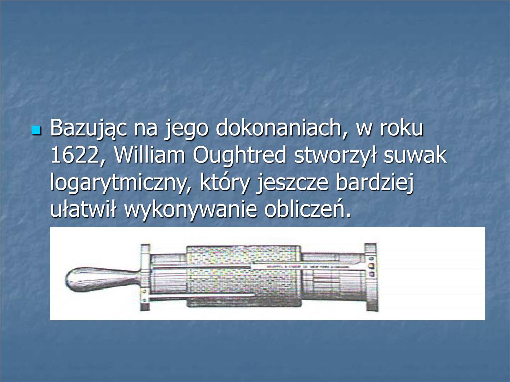 Bazując na jego dokonaniach, w roku 1622, William Oughtred stworzył suwak logarytmiczny, który jeszcze bardziej ułatwił wykonywanie obliczeń.