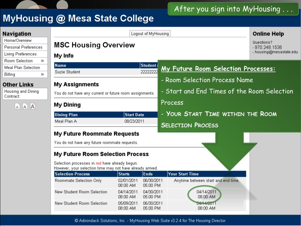 After you sign into MyHousing . . . • My Future Room Selection Processes: • Room Selection Process Name • Start and End Times of the Room Selection Process • Your Start Time within the Room Selection Process