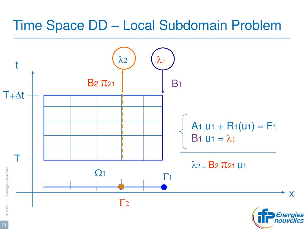 Time Space DD – Local Subdomain Problem l2 l1 t B2 p21 B1 T+Dt A1 u1 + R1(u1) = F1 B1 u1 = l1 T l2=B2 p21 u1 W1 G1 x G2