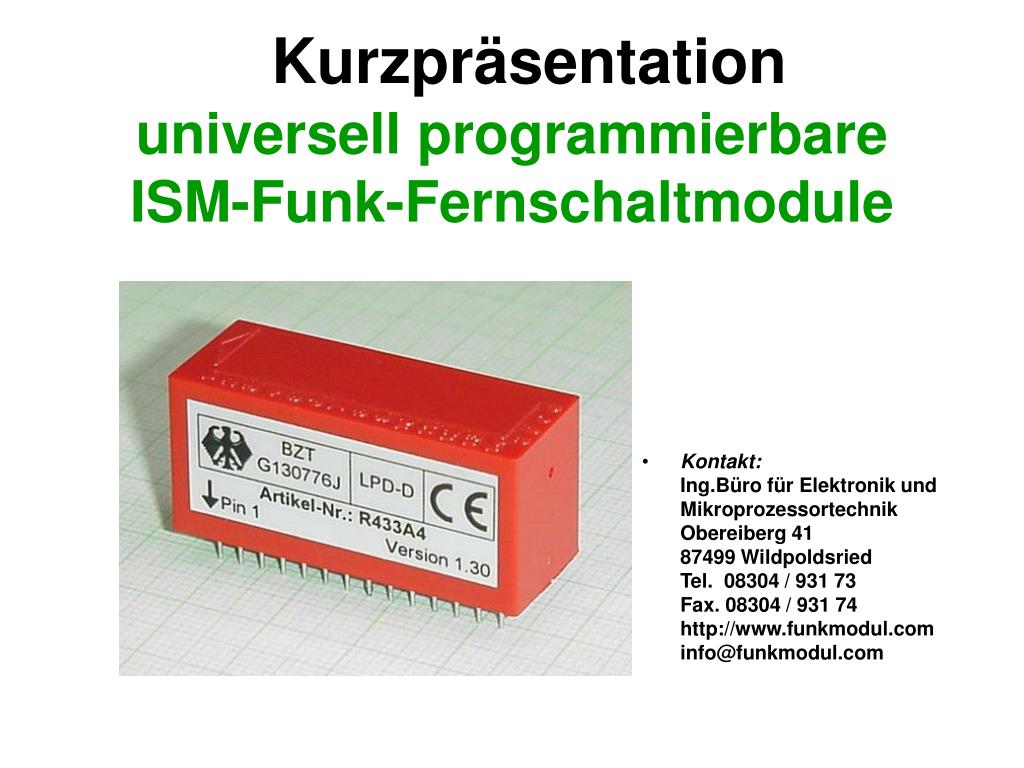 Kontakt: Ing.Büro für Elektronik und Mikroprozessortechnik Obereiberg 41 87499 Wildpoldsried Tel. 08304 / 931 73 Fax. 08304 / 931 74 http://www.funkmodul.com info@funkmodul.com. Kurzpräsentation. universell programmierbare ISM-Funk-Fernschaltmodule. Einleitung.