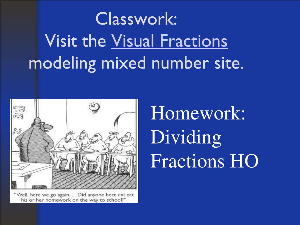 Classwork: Visit the Visual Fractions modeling mixed number site. Homework: Dividing Fractions HO