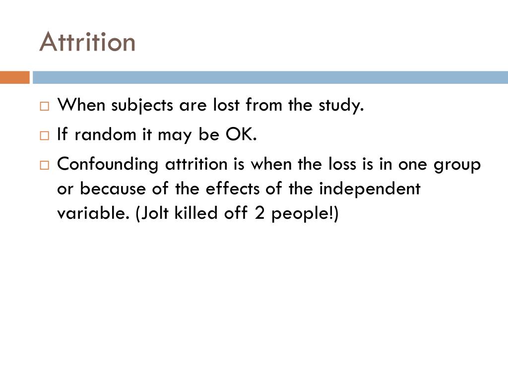 Attrition • When subjects are lost from the study. • If random it may be OK. • Confounding attrition is when the loss is in one group or because of the effects of the independent variable. (Jolt killed off 2 people!)