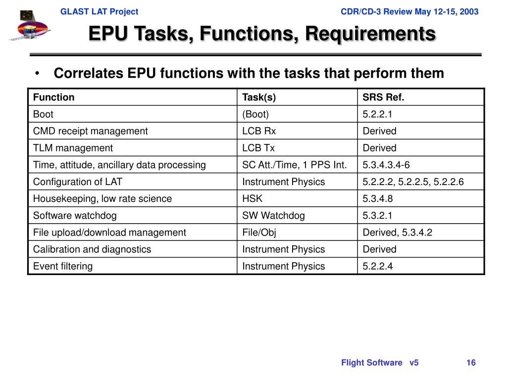 EPU Tasks, Functions, Requirements • Correlates EPU functions with the tasks that perform them