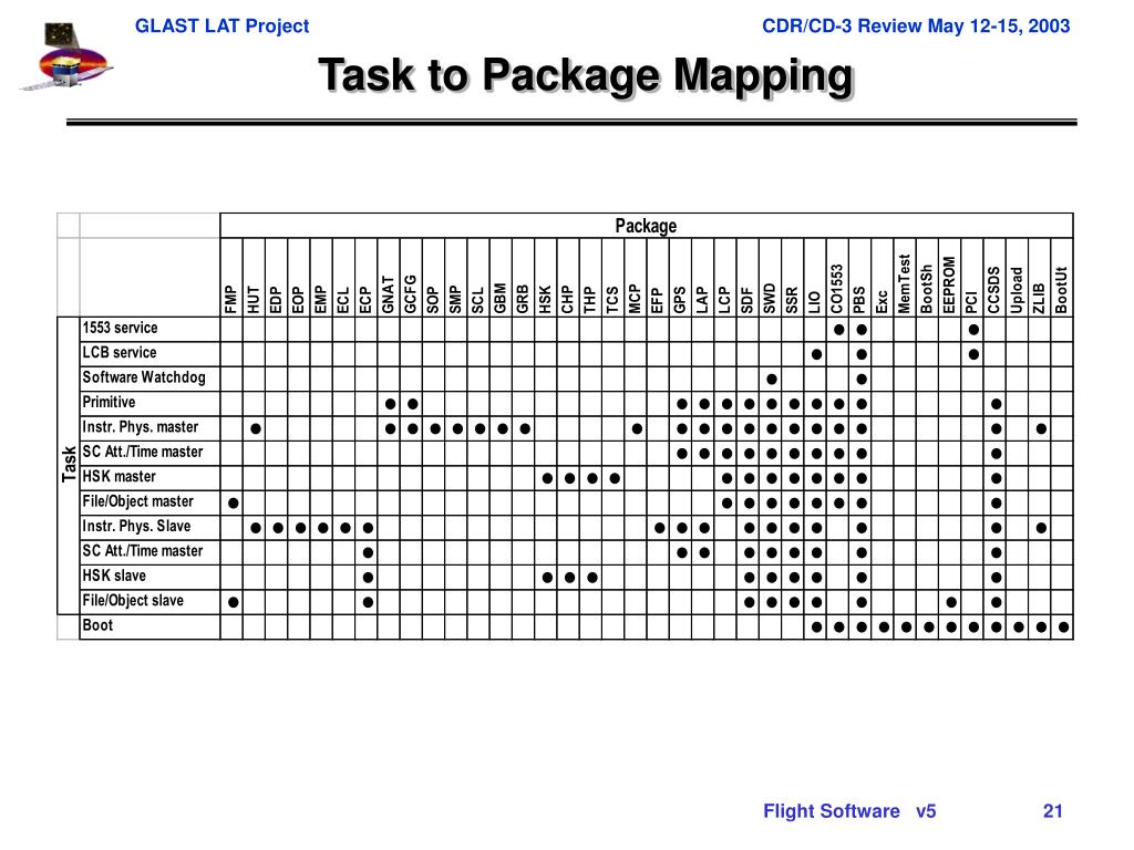 FSW Packages • FSW partitioned into functional blocks, then tasks, based on the SRS • Tasks are then mapped into packages, the fundamental unit of the code management system • Package Development • Detailed design elements (algorithms, finite state diagrams, logic flows, etc.) and development notes are generated on a per package basis • Design information is stored in a Software Development Folder (SDF) which accompanies each package • Contents of SDF are version controlled alongside the package’s code using the code management system • As the software matures, design descriptions from the SDFs evolve along with the code to provide a complete set of detailed design documentation • Unit tests are developed and code managed within the package