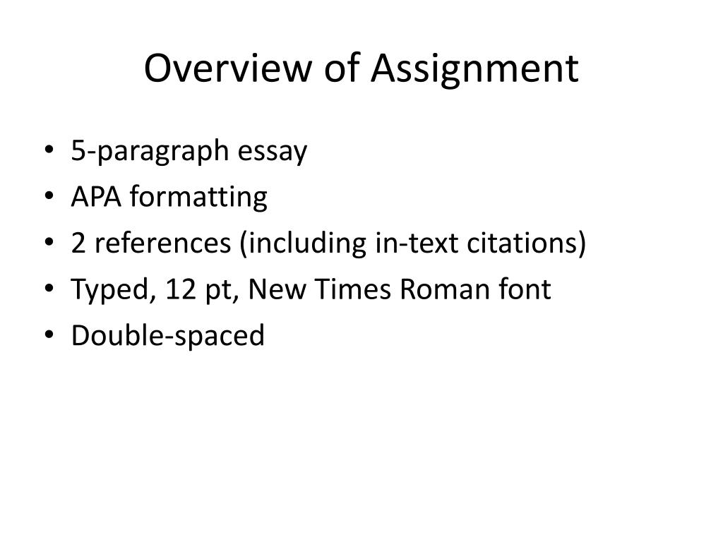 Overview of Assignment • 5-paragraph essay • APA formatting • 2 references (including in-text citations) • Typed, 12 pt, New Times Roman font • Double-spaced