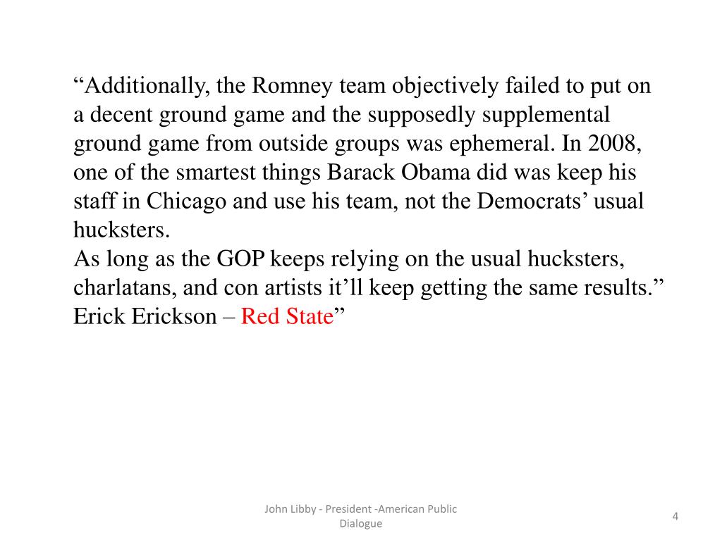 “Additionally, the Romney team objectively failed to put on a decent ground game and the supposedly supplemental ground game from outside groups was ephemeral. In 2008, one of the smartest things Barack Obama did was keep his staff in Chicago and use his team, not the Democrats’ usual hucksters. As long as the GOP keeps relying on the usual hucksters, charlatans, and con artists it’ll keep getting the same results.” Erick Erickson – Red State” John Libby - President -American Public Dialogue