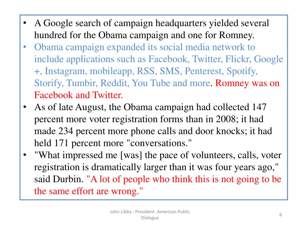A Google search of campaign headquarters yielded several hundred for the Obama campaign and one for Romney. • Obama campaign expanded its social media network to include applications such as Facebook, Twitter, Flickr, Google +, Instagram, mobileapp, RSS, SMS, Penterest, Spotify, Storify, Tumbir, Reddit, You Tube and more. Romney was on Facebook and Twitter. • As of late August, the Obama campaign had collected 147 percent more voter registration forms than in 2008; it had made 234 percent more phone calls and door knocks; it had held 171 percent more "conversations." • "What impressed me [was] the pace of volunteers, calls, voter registration is dramatically larger than it was four years ago," said Durbin. "A lot of people who think this is not going to be the same effort are wrong." John Libby - President -American Public Dialogue