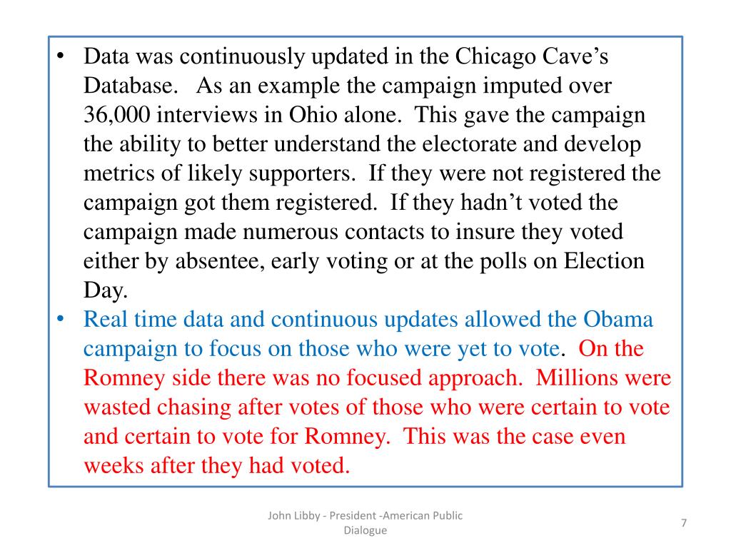 Data was continuously updated in the Chicago Cave’s Database. As an example the campaign imputed over 36,000 interviews in Ohio alone. This gave the campaign the ability to better understand the electorate and develop metrics of likely supporters. If they were not registered the campaign got them registered. If they hadn’t voted the campaign made numerous contacts to insure they voted either by absentee, early voting or at the polls on Election Day. • Real time data and continuous updates allowed the Obama campaign to focus on those who were yet to vote. On the Romney side there was no focused approach. Millions were wasted chasing after votes of those who were certain to vote and certain to vote for Romney. This was the case even weeks after they had voted. John Libby - President -American Public Dialogue