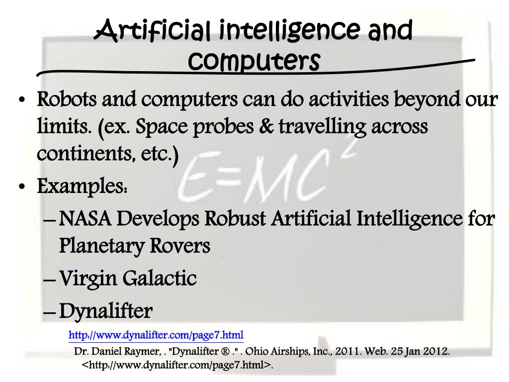 Artificial intelligence and computers • Robots and computers can do activities beyond our limits. (ex. Space probes & travelling across continents, etc.) • Examples: • NASA Develops Robust Artificial Intelligence for Planetary Rovers • Virgin Galactic • Dynalifter http://www.dynalifter.com/page7.html Dr. Daniel Raymer, . "Dynalifter ® ." . Ohio Airships, Inc., 2011. Web. 25 Jan 2012. <http://www.dynalifter.com/page7.html>.