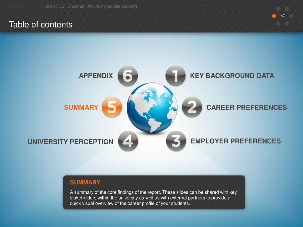 Table of contents 2013 | US | Students | All undergraduate students APPENDIX KEY BACKGROUND DATA SUMMARY CAREER PREFERENCES EMPLOYER PREFERENCES UNIVERSITY PERCEPTION • SUMMARYA summary of the core findings of the report. These slides can be shared with key stakeholders within the university as well as with external partners to provide a quick visual overview of the career profile of your students.