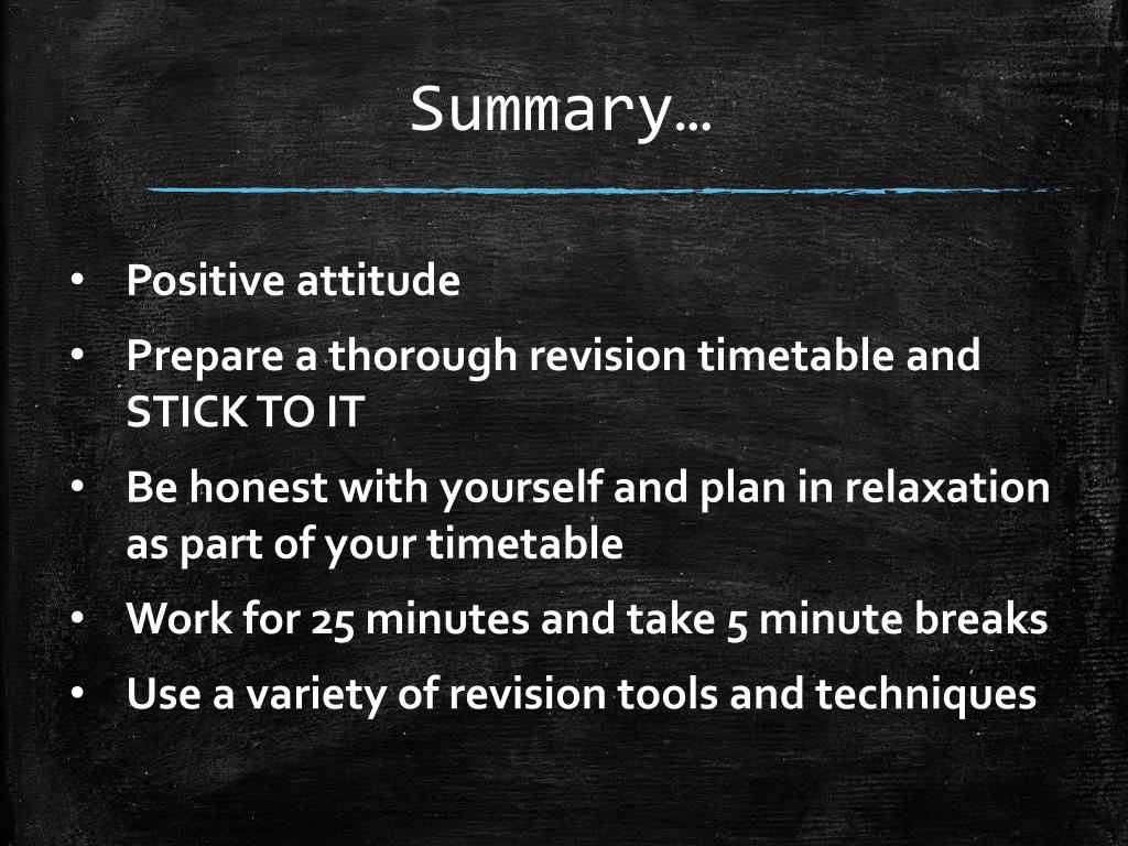 Summary… • Positive attitude • Prepare a thorough revision timetable and STICK TO IT • Be honest with yourself and plan in relaxation as part of your timetable • Work for 25 minutes and take 5 minute breaks • Use a variety of revision tools and techniques