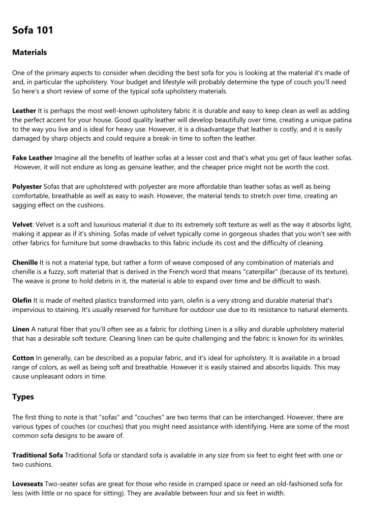 Sofa 101 Materials One of the primary aspects to consider when deciding the best sofa for you is looking at the material it's made of and, in particular the upholstery. Your budget and lifestyle will probably determine the type of couch you'll need So here's a short review of some of the typical sofa upholstery materials. Leather It is perhaps the most well-known upholstery fabric it is durable and easy to keep clean as well as adding the perfect accent for your house. Good quality leather will develop beautifully over time, creating a unique patina to the way you live and is ideal for heavy use. However, it is a disadvantage that leather is costly, and it is easily damaged by sharp objects and could require a break-in time to soften the leather. Fake Leather Imagine all the benefits of leather sofas at a lesser cost and that's what you get of faux leather sofas. However, it will not endure as long as genuine leather, and the cheaper price might not be worth the cost. Polyester Sofas that are upholstered with polyester are more affordable than leather sofas as well as being comfortable, breathable as well as easy to wash. However, the material tends to stretch over time, creating an sagging effect on the cushions. Velvet: Velvet is a soft and luxurious material it due to its extremely soft texture as well as the way it absorbs light, making it appear as if it's shining. Sofas made of velvet typically come in gorgeous shades that you won't see with other fabrics for furniture but some drawbacks to this fabric include its cost and the difficulty of cleaning. Chenille It is not a material type, but rather a form of weave composed of any combination of materials and chenille is a fuzzy, soft material that is derived in the French word that means "caterpillar" (because of its texture). The weave is prone to hold debris in it, the material is able to expand over time and be difficult to wash. Olefin It is made of melted plastics transformed into yarn, olefin is a very strong and durable material that's impervious to staining. It's usually reserved for furniture for outdoor use due to its resistance to natural elements. Linen A natural fiber that you'll often see as a fabric for clothing Linen is a silky and durable upholstery material that has a desirable soft texture. Cleaning linen can be quite challenging and the fabric is known for its wrinkles. Cotton In generally, can be described as a popular fabric, and it's ideal for upholstery. It is available in a broad range of colors, as well as being soft and breathable. However it is easily stained and absorbs liquids. This may cause unpleasant odors in time. Types The first thing to note is that "sofas" and "couches" are two terms that can be interchanged. However, there are various types of couches (or couches) that you might need assistance with identifying. Here are some of the most common sofa designs to be aware of. Traditional Sofa Traditional Sofa or standard sofa is available in any size from six feet to eight feet with one or two cushions. Loveseats Two-seater sofas are great for those who reside in cramped space or need an old-fashioned sofa for less (with little or no space for sitting). They are available between four and six feet in width.