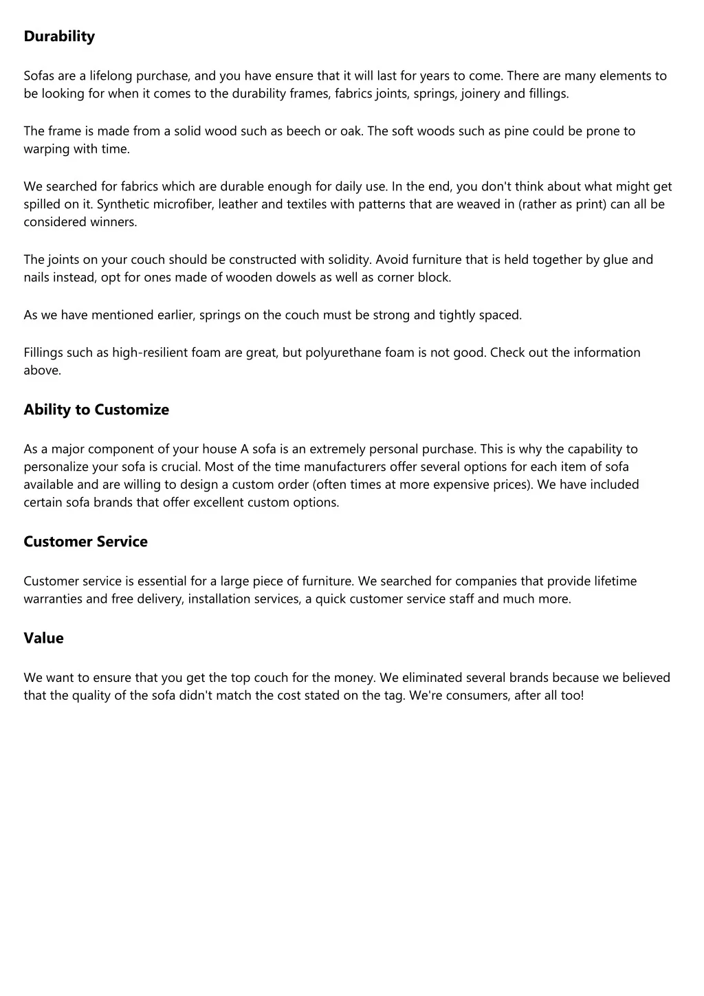Durability Sofas are a lifelong purchase, and you have ensure that it will last for years to come. There are many elements to be looking for when it comes to the durability frames, fabrics joints, springs, joinery and fillings. The frame is made from a solid wood such as beech or oak. The soft woods such as pine could be prone to warping with time. We searched for fabrics which are durable enough for daily use. In the end, you don't think about what might get spilled on it. Synthetic microfiber, leather and textiles with patterns that are weaved in (rather as print) can all be considered winners. The joints on your couch should be constructed with solidity. Avoid furniture that is held together by glue and nails instead, opt for ones made of wooden dowels as well as corner block. As we have mentioned earlier, springs on the couch must be strong and tightly spaced. Fillings such as high-resilient foam are great, but polyurethane foam is not good. Check out the information above. Ability to Customize As a major component of your house A sofa is an extremely personal purchase. This is why the capability to personalize your sofa is crucial. Most of the time manufacturers offer several options for each item of sofa available and are willing to design a custom order (often times at more expensive prices). We have included certain sofa brands that offer excellent custom options. Customer Service Customer service is essential for a large piece of furniture. We searched for companies that provide lifetime warranties and free delivery, installation services, a quick customer service staff and much more. Value We want to ensure that you get the top couch for the money. We eliminated several brands because we believed that the quality of the sofa didn't match the cost stated on the tag. We're consumers, after all too!