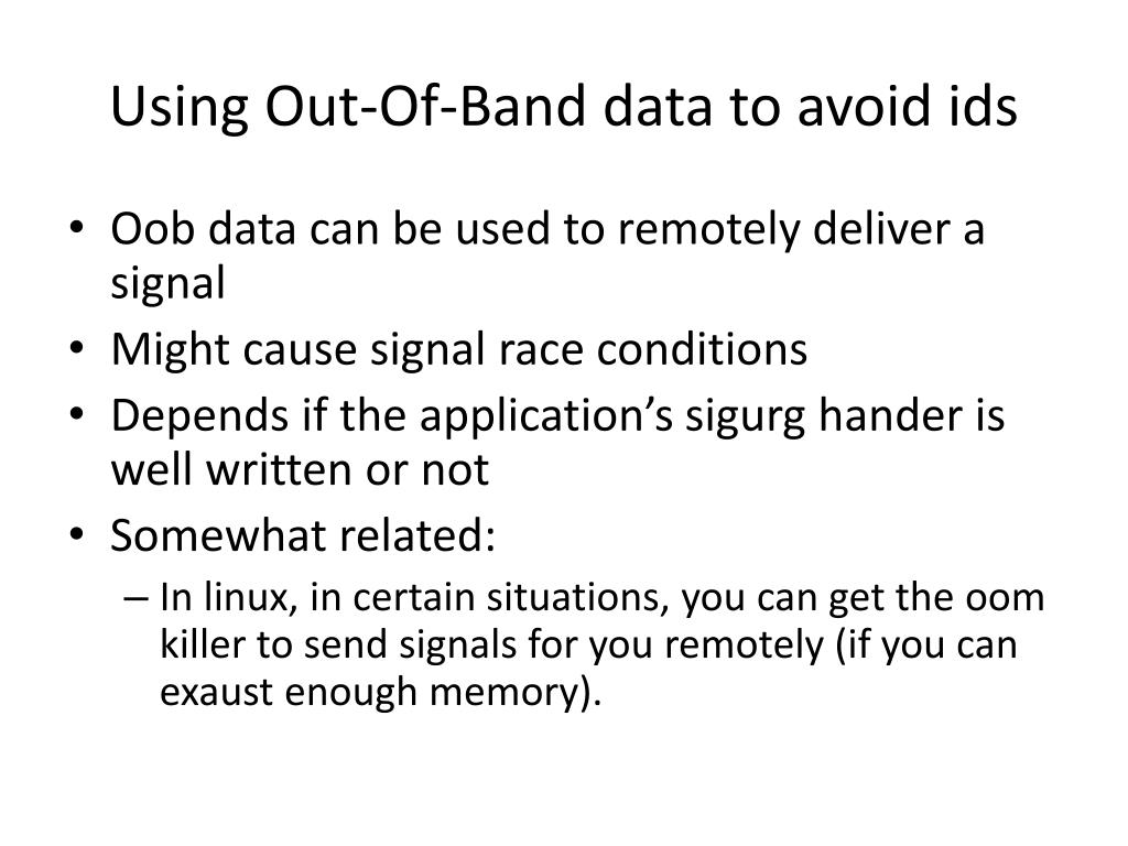 Using Out-Of-Band data to avoid ids • Oob data can be used to remotely deliver a signal • Might cause signal race conditions • Depends if the application’s sigurg hander is well written or not • Somewhat related: • In linux, in certain situations, you can get the oom killer to send signals for you remotely (if you can exaust enough memory).