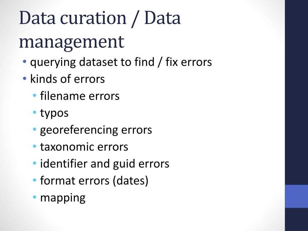 Data curation / Data management • querying dataset to find / fix errors • kinds of errors • filename errors • typos • georeferencing errors • taxonomic errors • identifier and guid errors • format errors (dates) • mapping