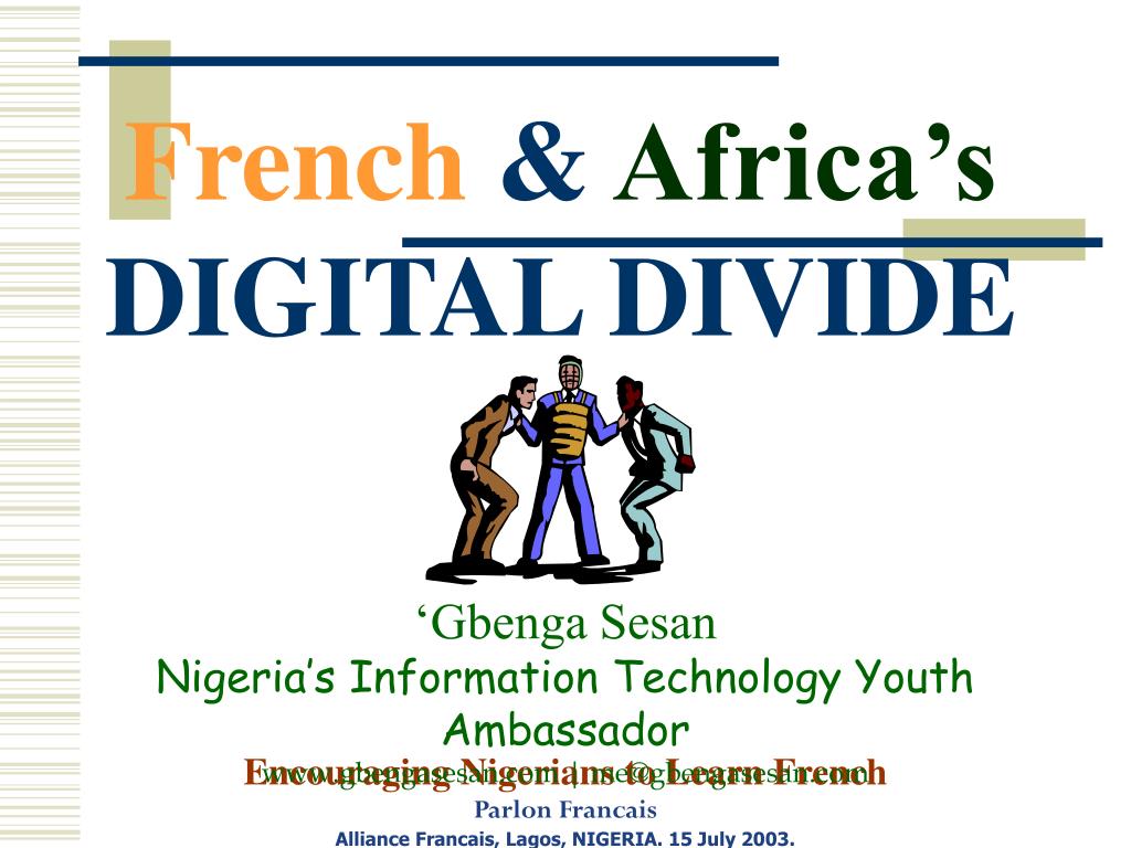 French & Africa’s DIGITAL DIVIDE ‘Gbenga SesanNigeria’s Information Technology Youth Ambassadorwww.gbengasesan.com | me@gbengasesan.com Encouraging Nigerians to Learn FrenchParlon FrancaisAlliance Francais, Lagos, NIGERIA. 15 July 2003.