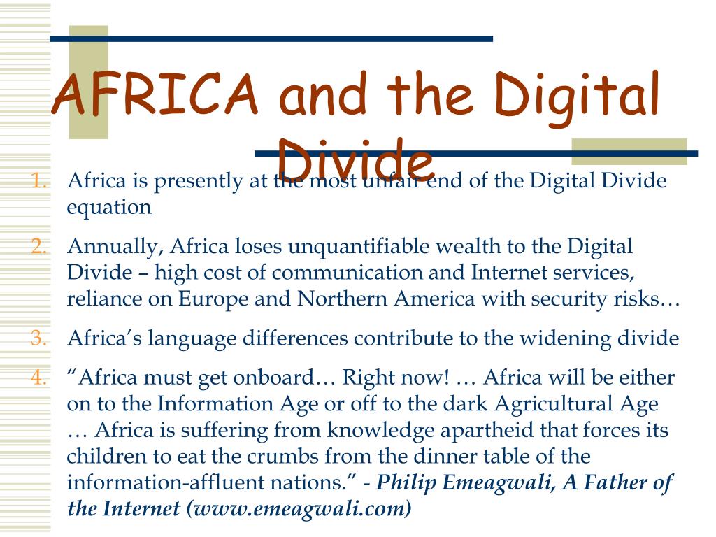 AFRICA and the Digital Divide Africa is presently at the most unfair end of the Digital Divide equation Annually, Africa loses unquantifiable wealth to the Digital Divide – high cost of communication and Internet services, reliance on Europe and Northern America with security risks… Africa’s language differences contribute to the widening divide “Africa must get onboard… Right now! … Africa will be either on to the Information Age or off to the dark Agricultural Age … Africa is suffering from knowledge apartheid that forces its children to eat the crumbs from the dinner table of the information-affluent nations.” - Philip Emeagwali, A Father of the Internet (www.emeagwali.com)