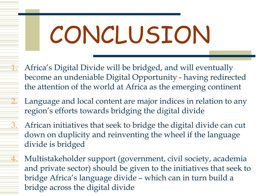 CONCLUSION Africa’s Digital Divide will be bridged, and will eventually become an undeniable Digital Opportunity - having redirected the attention of the world at Africa as the emerging continent Language and local content are major indices in relation to any region’s efforts towards bridging the digital divide African initiatives that seek to bridge the digital divide can cut down on duplicity and reinventing the wheel if the language divide is bridged Multistakeholder support (government, civil society, academia and private sector) should be given to the initiatives that seek to bridge Africa’s language divide – which can in turn build a bridge across the digital divide