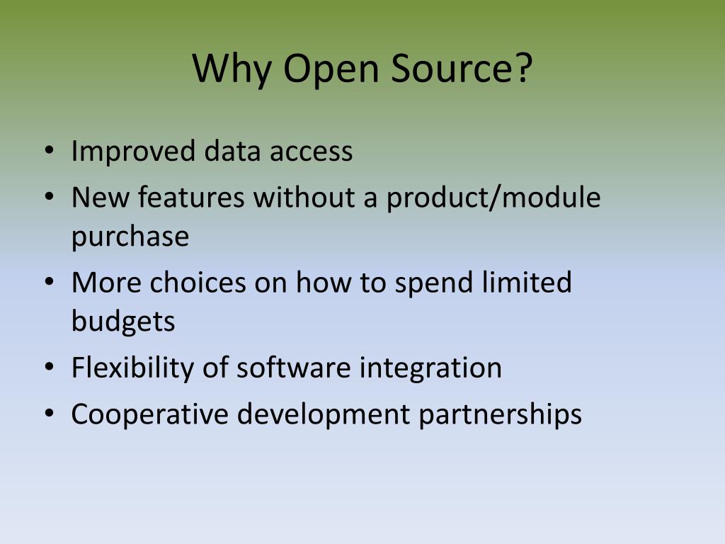 Why Open Source? • Improved data access • New features without a product/module purchase • More choices on how to spend limited budgets • Flexibility of software integration • Cooperative development partnerships