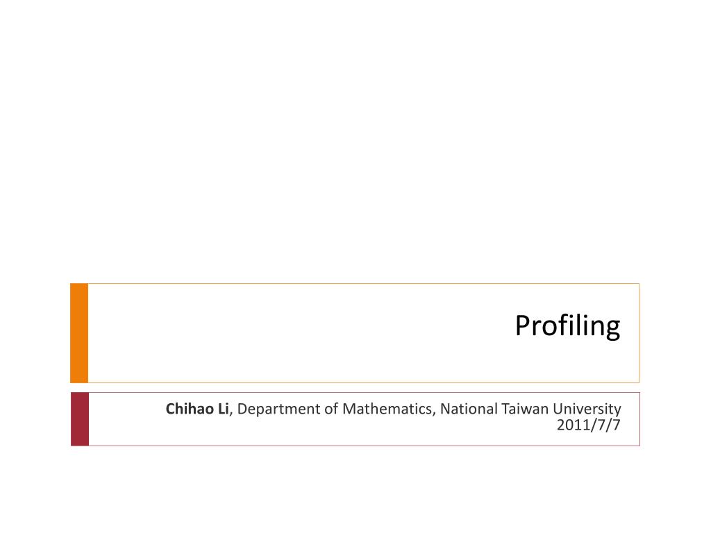 Profiling. Chihao Li , Department of Mathematics, National Taiwan University 2011/7/7. What is Profiling?. A good program need?. Accuracy? Effeciency ? Readability? Rewritability ? Easy to debug?. When to Profile?. Time to use is “using time”!.