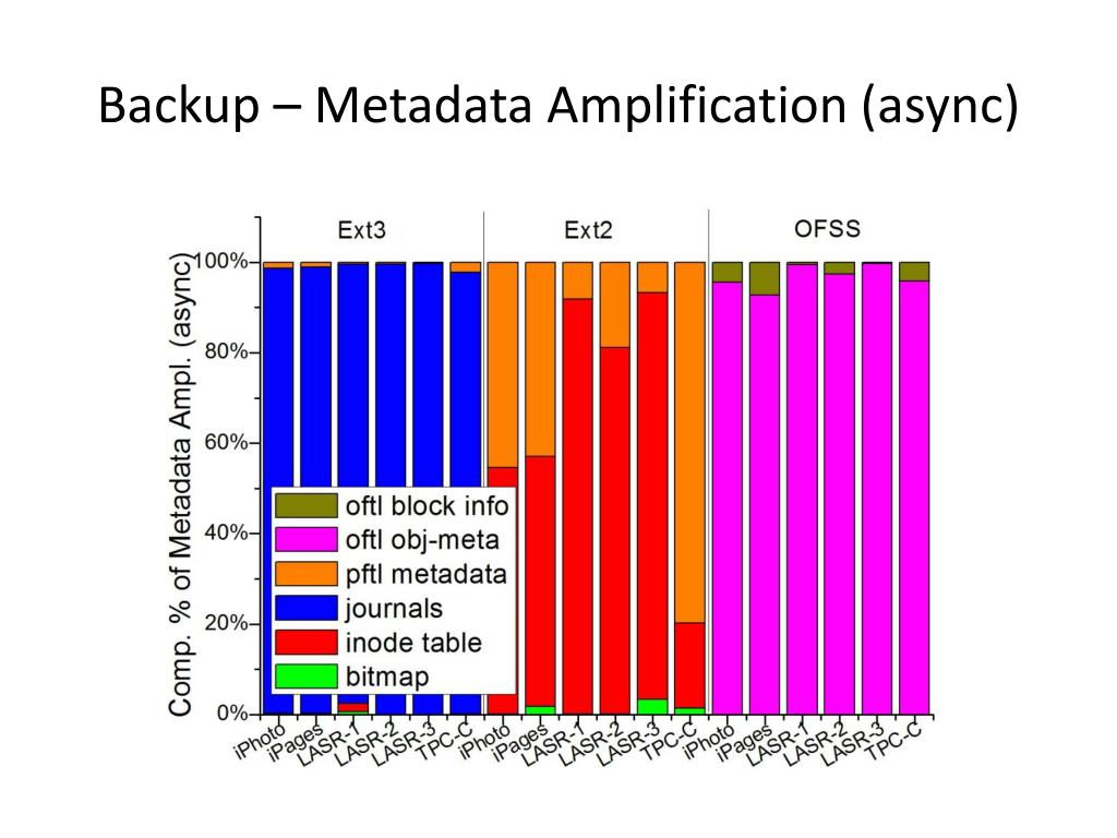 Metadata Amplification • In OFSS, meta ampl. is dramatically reduced • Ext3: Journaling • Ext2: Bitmap and Inode Table Refer to the paper for more details of the asyncmode