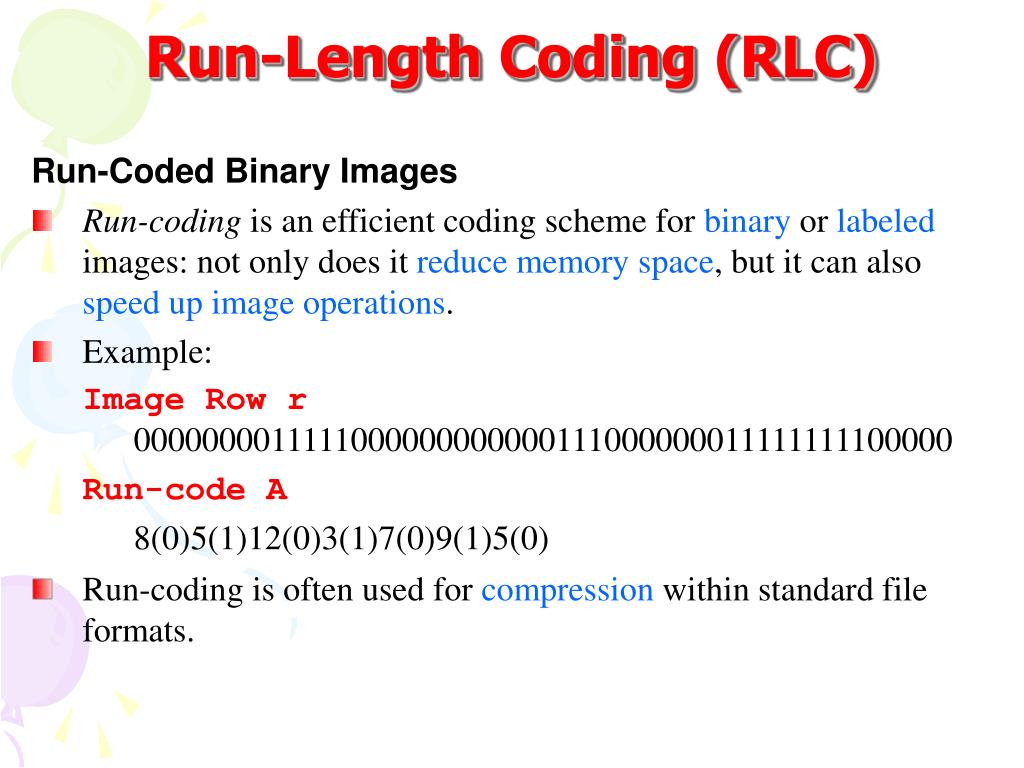 Run-Length Coding (RLC) • Run‑Coded Binary Images • Run‑coding is an efficient coding scheme for binary or labeled images: not only does it reduce memory space, but it can also speed up image operations. • Example: • Image Row r0000000011111000000000000111000000011111111100000 • Run‑code A • 8(0)5(1)12(0)3(1)7(0)9(1)5(0) • Run‑coding is often used for compression within standard file formats.