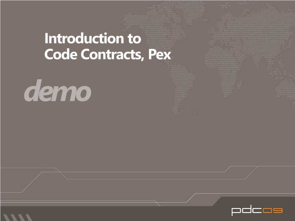 What you will learn Code Contracts Pex Automated Test Generation Parameterized Unit Testing Stubs and Moles Lightweight mocking For sealed classes, static methods, interfaces Expressing design intent Advanced unit testing • Method contracts • Contract.Requires • Contract.Ensures • Object invariants • Contract.Invariant • Interface contracts • Tools • Runtime Checking • Static Checking • Documentation