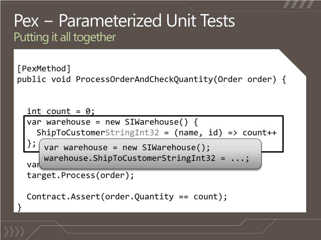 Pex − Parameterized Unit TestsPutting it all together [PexMethod] public void ProcessOrderAndCheckQuantity(Order order) { int count = 0; var warehouse = new SIWarehouse() { ShipToCustomerStringInt32 = (name, id) => count++ }; var target = new WebService(warehouse); target.Process(order); Contract.Assert(order.Quantity == count); } delegate(string name, int id) { count++; }