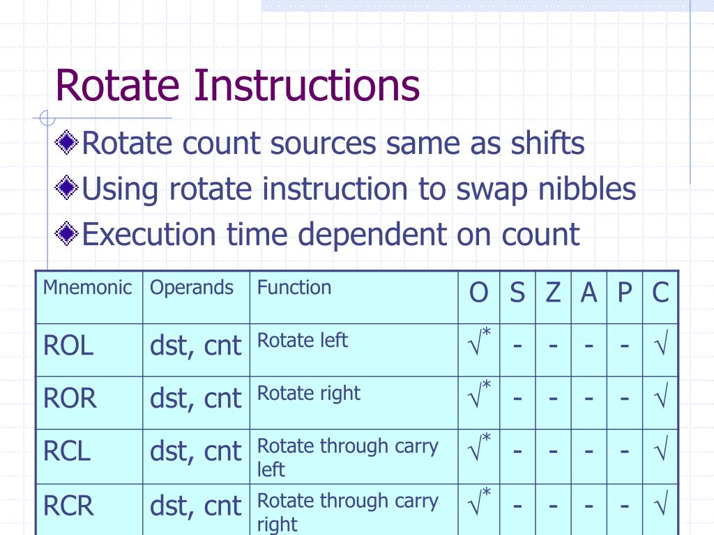 Rotate Instructions • Rotate count sources same as shifts • Using rotate instruction to swap nibbles • Execution time dependent on count