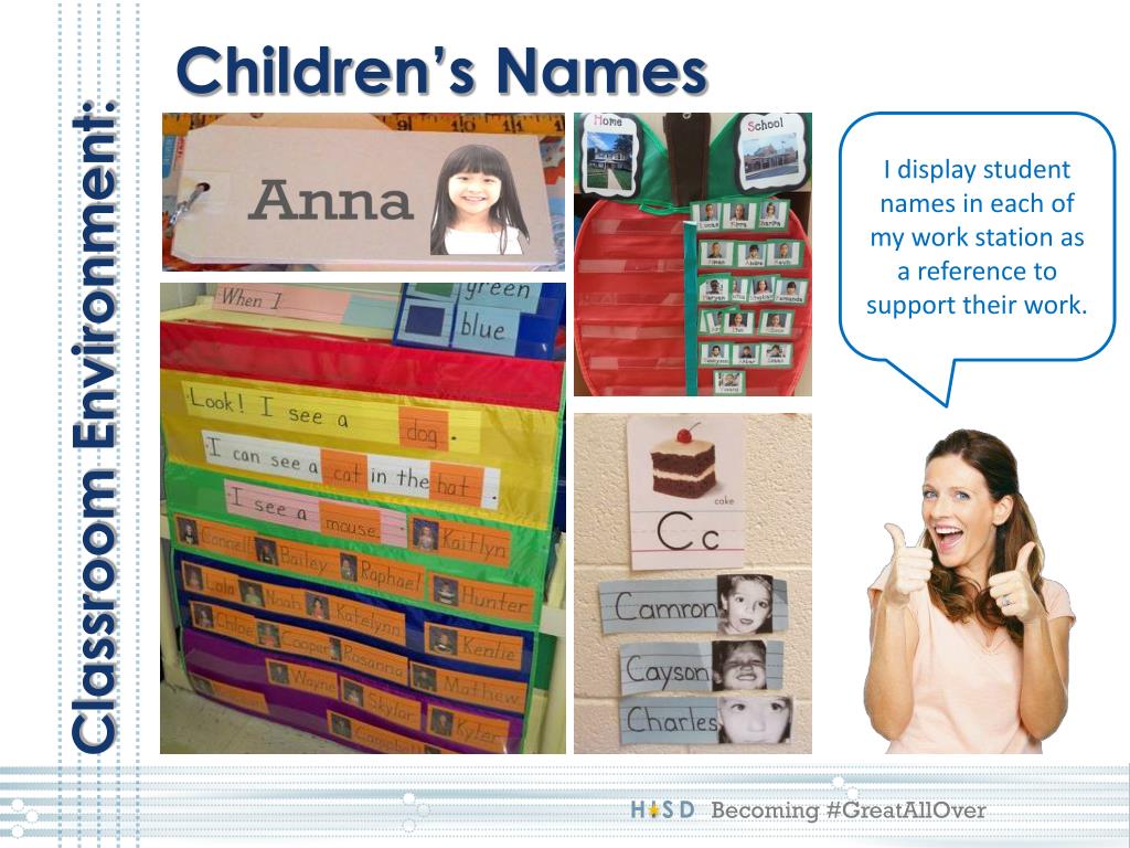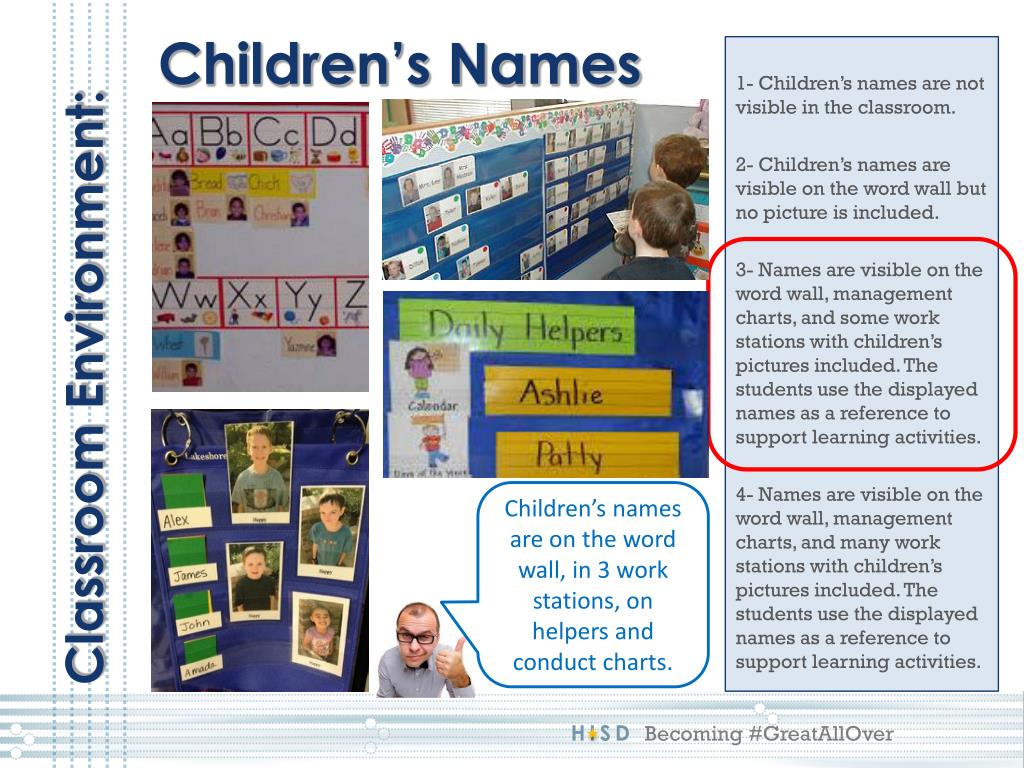 Children’s Names Classroom Environment: Children’s names are on the word wall, in 3 work stations, on helpers and conduct charts. 1- Children’s names are not visible in the classroom. 2- Children’s names are visible on the word wall but no picture is included. 3- Names are visible on the word wall, management charts, and some work stations with children’s pictures included. The students use the displayed names as a reference to support learning activities. 4- Names are visible on the word wall, management charts, and many work stations with children’s pictures included. The students use the displayed names as a reference to support learning activities.