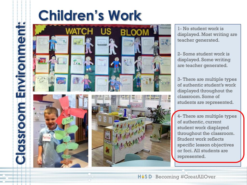 Children’s Work Classroom Environment: 1- No student work is displayed. Most writing are teacher generated. 2- Some student work is displayed. Some writing are teacher generated. 3- There are multiple types of authentic student’s work displayed throughout the classroom. Some of students are represented. 4- There are multiple types of authentic, current student work displayed throughout the classroom. Student work reflects specific lesson objectives or foci. All students are represented.