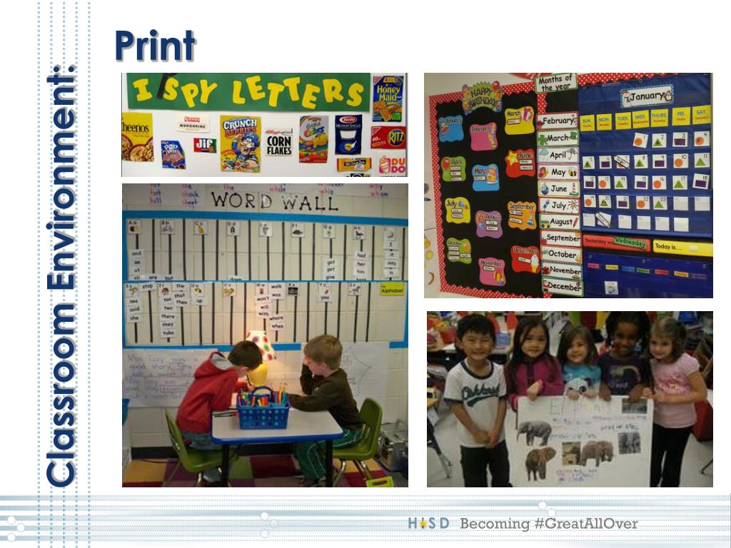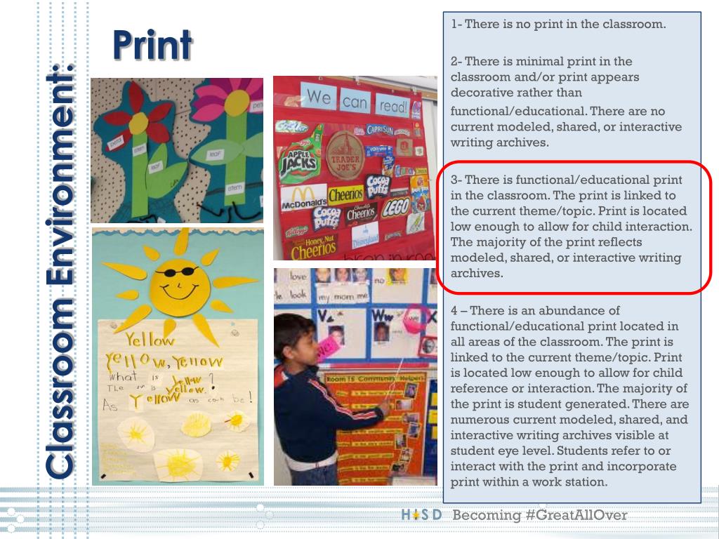 Print Classroom Environment: 1- There is no print in the classroom. 2- There is minimal print in the classroom and/or print appears decorative rather than functional/educational. There are no current modeled, shared, or interactive writing archives. 3- There is functional/educational print in the classroom. The print is linked to the current theme/topic. Print is located low enough to allow for child interaction. The majority of the print reflects modeled, shared, or interactive writing archives. 4 – There is an abundance of functional/educational print located in all areas of the classroom. The print is linked to the current theme/topic. Print is located low enough to allow for child reference or interaction. The majority of the print is student generated. There are numerous current modeled, shared, and interactive writing archives visible at student eye level. Students refer to or interact with the print and incorporate print within a work station.